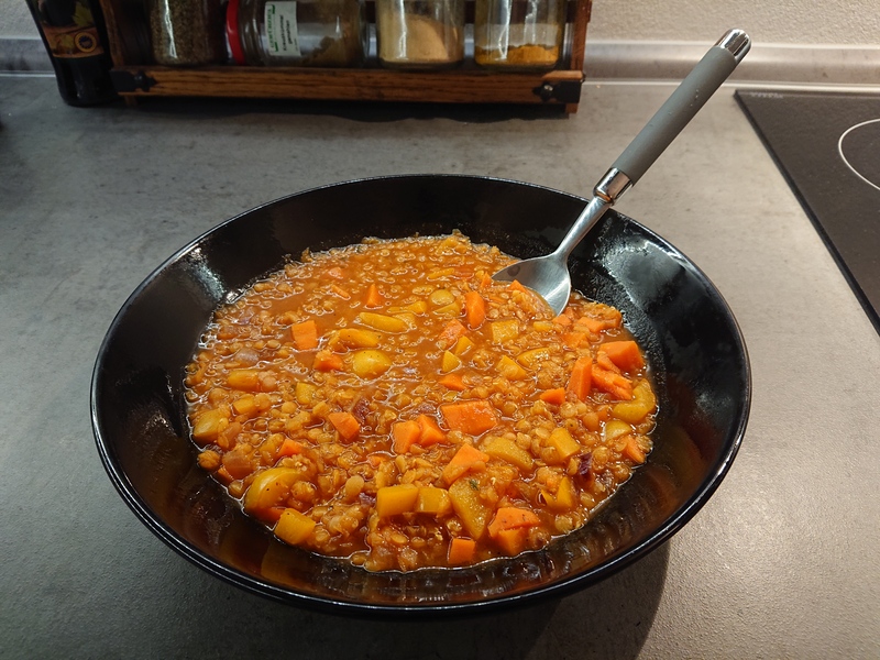 Linsen und Brühe in den Topf geben, aufkochen und ca. 10 Minuten köcheln lassen.